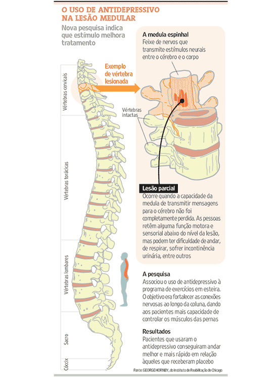 Um antidepressivo comum associado a um programa intensivo de treinamento em esteira pode ajudar pessoas com lesões parciais da medula espinhal a andar mais rapidamente e com mais desenvoltura, revela uma pesquisa inédita apresentada anteontem em congresso de neurociência que acontece em Chicago (EUA).